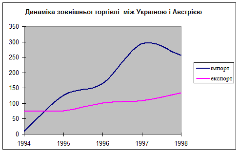 Дані графіку 1 свідчать, що негативне сальдо України у торгівлі з ЄС постійно зростало впродовж 1994 - 1997 років, зменшившись лише 1998 року порівняно з 1997 р. на 600 млн дол. Зменшення торго-вельного дефіциту 1998 р. стало і наслідком фінансової кризи в Україні, що призвела, зокрема, до відчутного знецінення української гривні, а відтак - до відносного подорожчання імпорту в умовах нестійкої платоспроможності українських імпортерів.