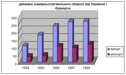 Торговий баланс між Україною і Францією е несбалансирований. Його динаміка весь час погіршується. Так, перемістившись з 1992 по 1998 рік з 94 на 63 позицію по обсягах імпорту французької продукції, Україна за той же час опустилася з 58 на 71 місце по обсягах експорту у Францію. Обсязі експорту морозило (чергувалися підйоми і падіння), він ні разу не зміг досягнути рівня 1992 року, а негативне сальдо, що утворилося в 1994 році весь час зростало (рис 11).