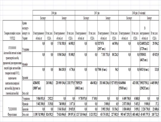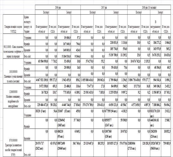 Обсяги експорту – імпорту у 2006 – 2008 роках по окремих групах товарів між Україною та Угорщиною, Францією і Бразилією [34]
