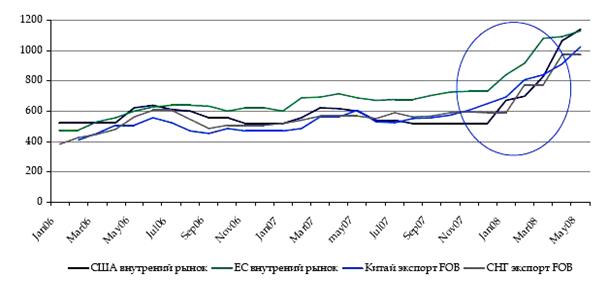 - Зростання цін на основну сировину (залізняк, що коксує вугілля) і витрат на транспортування заставляло виробників перекладати витрати на кінцевого споживача, що було здійснено за наявності стабільно зростаючого попиту.