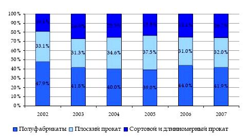 Товарна структура українських експортних постачань практично не змінялася: доля напівфабрикатів складає 40-44 %, плоского прокату - 30-35 %, довгомірного прокату - 25-27 %. У середньостроковій перспективі така тенденція, найшвидше, збережеться, і доля напівфабрикатів значно не зменшуватиметься. Цьому сприятимуть декілька чинників: