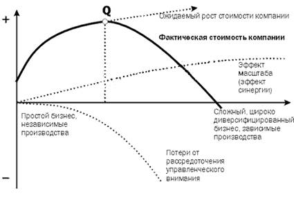Пока эффект масштаба покрывает потерями возникшими из-за усложнения объекта управления, суммарная составляющая этих эффектов имеет положительный знак и стоимость компании действительно возрастает по мере расширения спектра деятельности. Начиная с некоторого порогового значения (точка Q на графике), темпы роста эффекта масштаба замедляются, а потери увеличиваются возрастающими темпами. В результате снижаются денежные потоки, и предприятие обесценивается вопреки прогнозируемому в точке Q росту его стоимости.
