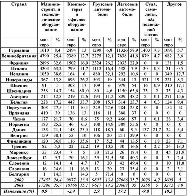Лизинг машиностроительного и технологического оборудования наиболее распространен в Италии как по объему операций 4303 млн. евро, так и по его доле в общем объеме лизинга - 63.2%, Испании - 1059 млн. евро или 38.6%, Франции - 2896 млн. евро или 32.46% соответственно. Лидером по абсолютному объему лизинга этого имущества является Великобритания -4790 млн. евро или 25.4% от общего объема. В Германии лизинг машиностроительного и технологического оборудования не распространен.