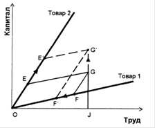 Предположим, что размеры капитала возросли на GG', при этом размеры другого фактора производства (труда) и цены на товары 1 и 2 остались неизменными. Если построить новую параллелограмму от точки G', показывающей изменившийся уровень обеспеченности капиталом, то очевидно, что после роста обеспеченности капиталом производство трудоемкого товара 1 переместится в точку F', а производство капиталоемкого товара 2 — в точку Е'. Производство капиталоемкого товара 2 в результате увеличения размеров капитала возросло на ЕЕ', а производство трудоемкого товара 1 сократилось на FF'. Тем самым увеличение обеспеченности одним из факторов приводит к росту выпуска того товара, для производства которого он используется относительно более интенсивно, и сокращению выпуска товара, для производства которого он используется относительно менее интенсивно. Нетрудно также заметить, что ЕЕ70Е > GG7JG. Это означает, что увеличение размеров капитала привело к пропорционально большему увеличению производства капиталоемкого товара.