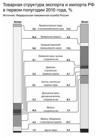 Главный товар России на мировом рынке — по-прежнему продукция нефтяной и деревообрабатывающей промышленности, где главными российскими соперниками являются ЕС, Сингапур, США, Южная Корея, Объединенные Арабские Эмираты, Нигерия, Норвегия и Канада. Появились и новые отрасли, где нарастает конкуренция, — это добыча никеля, производство никелевых продуктов, удобрений и минерального топлива. Максимальные темпы роста товарооборота с Россией в 2000—2009 годы показали Южная Корея (+463,43%), Казахстан (+291,01%) и Турция (+231,38%).