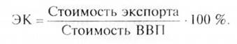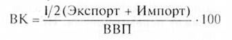 • внешнеторговая квота определяется как соотношение совокупной стоимости экспорта и импорта, деленной пополам, к стоимости ВВП в процентах: