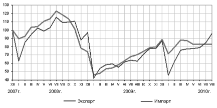Рис. 1. Динамика экспорта и импорта Российской Федерации, в % к декабрю 2007 г.