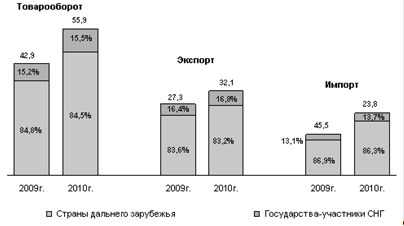 Внешнеторговый оборот по данным таможенной статистикив августе 2010г. составил 52,3 млрд.долларов США. Экспорт составил 30,6 млрд.долларов, в том числе в страны дальнего зарубежья - 26,3 млрд.долларов, в государства-участники СНГ - 4,2 млрд.долла-ров. Импорт составил 21,8 млрд.долларов, в том числе из стран дальнего зарубежья - 19,4 млрд. долларов, из государств-участников СНГ - 2,4 млрд.долларов (Приложение 2).