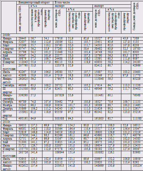 Внешнеторговый оборот с основными странами партнерами в январе августе 2010 года составил 386116 млн. долл. США, экспорт при этом составил 250283 млн. долл. США, импорт составил 135832 млн. долл. США (Таблица 1).