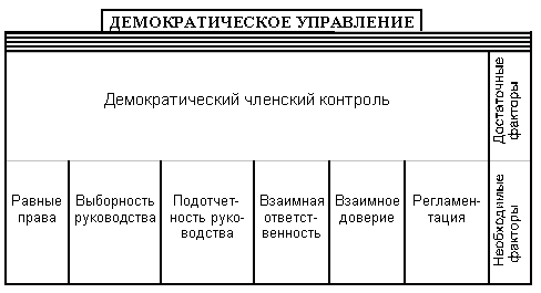 демократичности управления потребительским обществом (один пайщик - один голос, обязательная подотчетность общему собранию потребительского общества других органов управления, органов контроля, свободное участие пайщика в выборных органах потребительского общества);