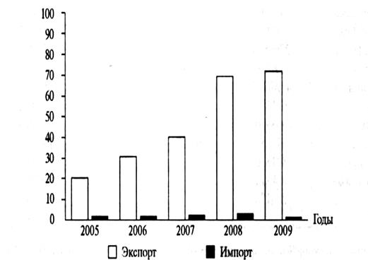Торговля услугами Украины со странами ЗА отстает от торговли товарами в десятки раз. В частности, в 2008 г. стоимость украинского экспорта товаров в страны ЗА составила 371,3 млн. дол., а услуг — 71,4 млн. дол. Однако здесь наблюдается тенденция к росту объемов (рис. 2).