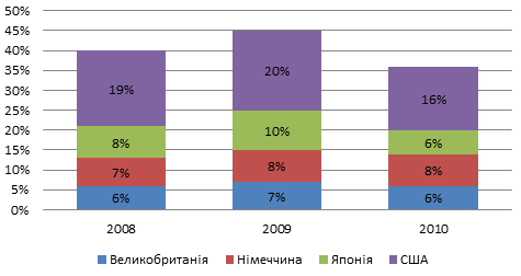 Тож провідними країнам з виробництва медикаментів є: США, Франція, Японія, Німеччина та Великобританія. Для більш точного аналізу країн-лідерів з виробництва лікарських засобів необхідно проаналізувати долю кожної з цих країн в загальному фармацевтичному виробництві в період з 2008 до 2009 років. [33]