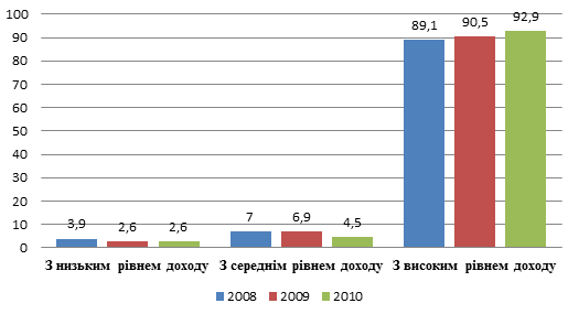 Рис. 1.2 Частка країн з низьким, середнім та високим рівнем розвитку у фармацевтичній промисловості (%)