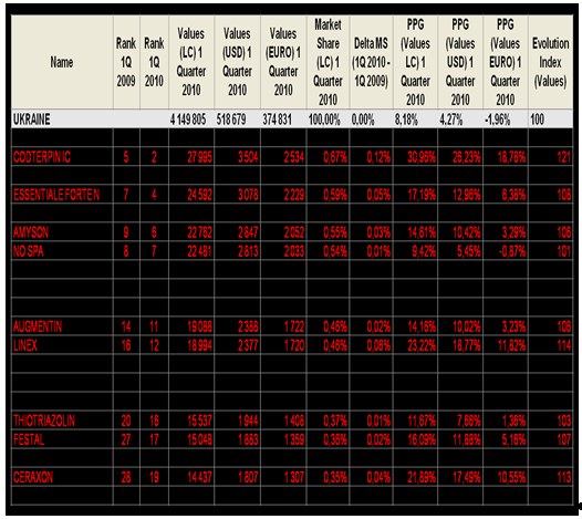Рейтинг торговых марок лекарственных средств в денежном выражении по итогам первого квартала 2010 года.