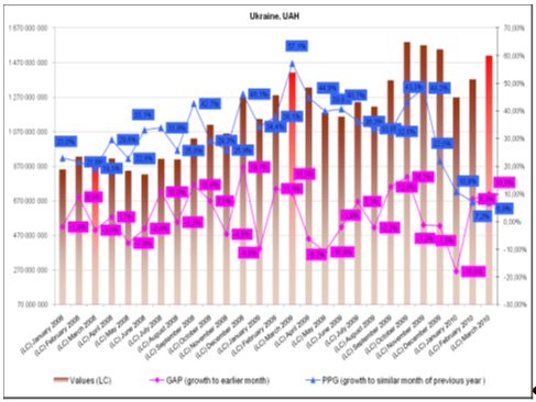 * На діаграмах темп приросту до аналогічного періоду минулого року (PPG) виділена синім кольором. Темп приросту по відношенню до попереднього місяця (GAP) позначено рожевим кольором).