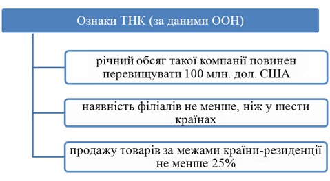 Експерти ООН виокремили наступні ознаки, за наявності яких компанію можна віднести до транснаціональної ( рис. 1.1.).