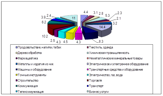 Ведущими отраслями транснациональной деятельности по данным на 2009 г. являются производство электрического и электронного оборудования (14,4%), бизнес-услуги (11,0%), торговля (10,2%), производство машин и оборудования (8,3%) от общего числа компаний (рис. 2).