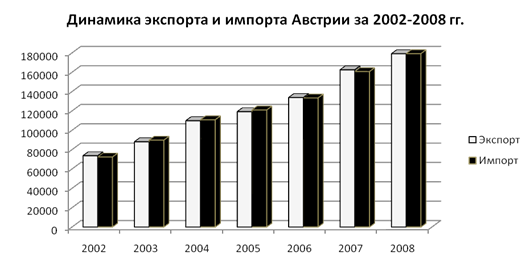 Во время анализа было выявлено что на душу населения в Австрии приходится в среднем 15000$ как от экспорта, так и от импорта (в 2008 г. около 21476$ от экспорта и 21488$ от импорта). В течении всего изучаемого периода как доля экспорта, так и доля импорта постоянно увеличивалась.