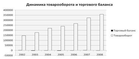 Итак, общая тенденция товарооборота положительная. Тенденция торгового баланса в основном отрицательная, хотя 2002, 2006, 2007 гг. торговый баланс был положительным. Наибольший рост торгового баланса (то есть наибольшее превышение экспорта над импортом) наблюдается в 2007 г., в том году - торговый баланс вырос на 38,7% по отношению к 2002 г. и в 3 раза по отношению к 2006 г. Динамика товарооборота более плавная, наибольший рост наблюдался в 2004 г. - 24,1%.