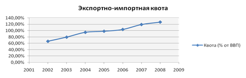 Экспортно-импортная квота составляет от 67% и почти до 127% от ВВП в разные годы, причем за последнее время доходы от экспорта составляют около 43% ВВП, в то же время расходы на импорт составили тоже около 43% ВВП.