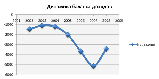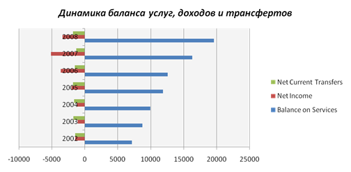 Баланс доходов все время отрицательный. Больше всего дефицит баланса доходов наблюдается в 2007 г. В целом, дефицит баланса доходов означает, что страна больше получает доходов, чем вывозит их в другие страны.