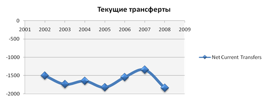 Динамика трансфертов имеет отрицательную тенденцию, баланс трансфертов находится в состоянии дефицита на протяжении всего исследуемого периода. Наибольший дефицит баланса трансфертов наблюдался в 2008 г. – 137%.
