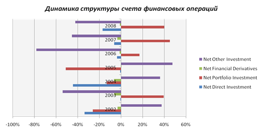 Итак, большую часть финансового счета составляют чистые портфельные инвестиции – около 45% в 2007 г. и 40% в 2008 г. Чистые портфельные инвестиции постоянно увеличивались с 2006г. до 2008г.