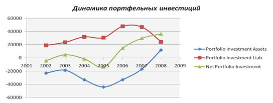 Чистые портфельные инвестиции имеют то отрицательное, то положительное сальдо, а с 2006 г. до 2008 г.баланс становится только положительным (происходит приток портфельных инвестиций).