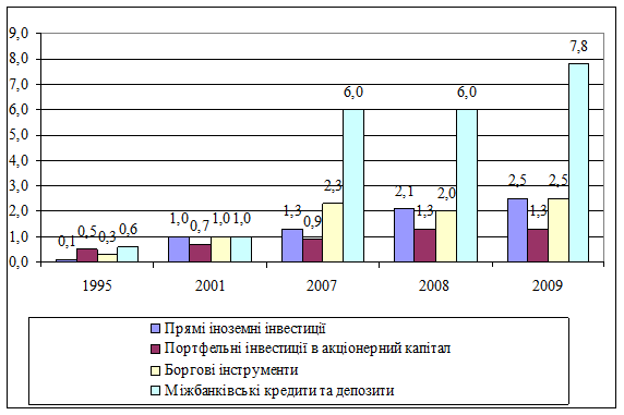 Як бачимо з діаграми динаміка міжнародного руху капіталу суттєво змінилася в бік збільшення величини потоків усіх структурних елементів капіталу. Лише протягом 2008-2009 років збільшення відбувалося дещо повільно, оскільки відчувалися наслідки світової економічної кризи.