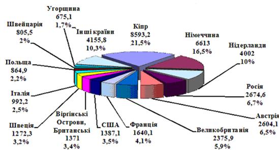 Рис. 3.1. Обсяги прямих інвестицій в україну станом на 01.01.2010 р. млн. дол. США