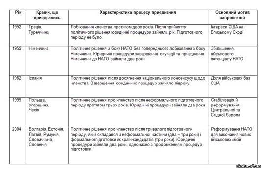 У січні 1994 року на Брюссельському самміті керівники країн - членів Альянсу підтвердили відкритість Альянсу для членства інших європейських держав, які спроможні втілювати в життя принципи Вашингтонського договору і робити свій внесок у безпеку північноатлантичного регіону. Після того як у грудні 1994 року міністри закордонних справ країн-учасниць ухвалили відповідне рішення, протягом 1995 року союзники вивчали усі "навіщо" та "як" майбутнього вступу нових членів. У результаті було підготоване "Дослідження з питань розширення НАТО", яке у вересні 1995 року було передане заінтересованим країнам-партнерам і оприлюднене. Викладені у Дослідженні принципи залишаються підґрунтям відкритого підходу НАТО до запрошення нових членів до вступу. Відповідаючи на запитання "навіщо проводити розширення НАТО", дослідники дійшли висновку, що по закінченні холодної війни та зникненні Організації Варшавського договору з'явилась як необхідність, так і унікальна можливість поліпшити безпеку в усьому євро - атлантичному регіоні, не відновлюючи лінії розмежування. Розширення НАТО є подальшим кроком до основної мети Альянсу - вдосконалення безпеки і поширення стабільності на весь євро - атлантичний регіон, що доповнює ширші тенденції до інтеграції, зокрема розширення ЄС і підсилення ОБСЄ. IЦе нікому не становить загрози. НАТО залишатиметься оборонним Альянсом, головною метою якого є збереження миру в євро - атлантичному регіоні та безпека його членів. Що ж до питання про те, "як" розширюватись, Дослідження підтвердило, що, як і в минулому, будь-яке майбутнє збільшення кількості членів Альянсу має здійснюватись через приєднання нових членів до Північноатлантичного договору згідно зі Статтею 10. Після вступу нові члени користуються всіма правами та приймають усі зобов'язання за Договором, їм необхідно погодитись з усіма принципами, процедурами та політикою, які схвалені членами Альянсу на момент їхнього вступу, та виконувати їх. У Дослідженні чітко зазначено, що бажання та спроможність взяти на себе такі зобов'язання не тільки на папері, а й на практиці є вирішальним чинником у прийнятті Альянсом рішення про запрошення тієї чи іншої країни до вступу [6, 33].