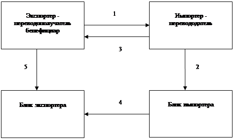 Банк импортера, приняв платежное поручение от импортера, направляет от своего имени платежное поручение (4) в соответствующий банк экспортера. Получив платежное поручение, банк проверяет его подлинность и совершает операцию по зачислению денег (5) на счет экспортера.