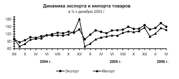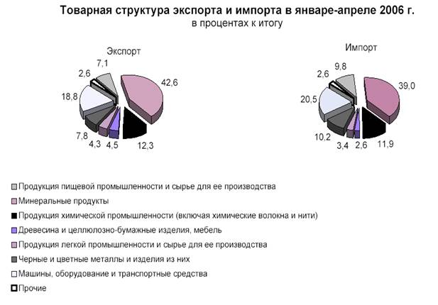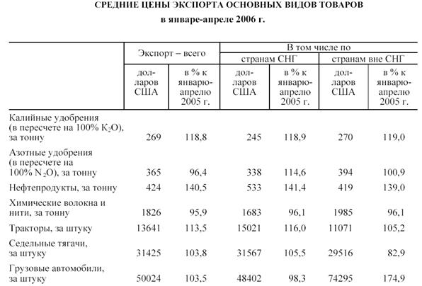 Увеличение стоимости экспорта и импорта произошло как за счет ростафизического объема, так и за счет повышения средних цен на экспортируемые и импортируемые товары. Темп роста средних цен экспорта к январю-апрелю 2005 г. составил 115,6%, импорта – 111,6%. При этом физический объем экспорта возрос на 7,7%, импорта – на 29,7%.