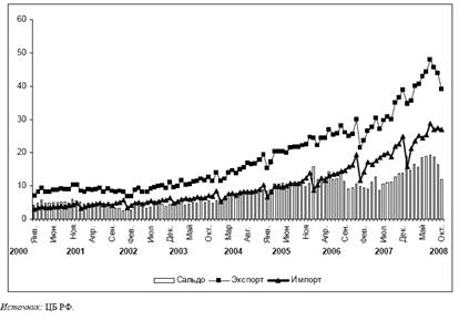 Сальдо торгового баланса в октябре 2008 г. сложилось положительным в размере 11,9 млрд. долл., что является самым низким показателем с сентября 2007 г. Благодаря взлету цен на нефть и другие сырьевые товары в первые 7 месяцев 2008 г. наблюдался опережающий рост экспорта по сравнению с импортом. В результате сальдо торгового баланса в январе-октябре 2008 г. составило 167,2 млрд. долл., увеличившись по сравнению с соответствующим периодом прошлого года в 1,6 раза. Однако снижение цен в сентябре и последовавший еще более сильный октябрьский обвал цен на многие сырьевые товары, прежде всего на нефть, приведет к коррекции внешнеторговых показателей. Резко обозначившаяся в 2007 г. проблема сокращения внешнеторгового профицита вновь обретает остроту с перспективой выхода на дефицитный баланс уже в ближайшее время.