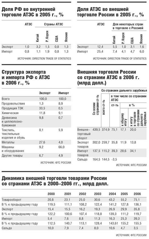 Пока РФ играет незначительную роль во внешней торговле стран АТЭС. Хотя за 2000—2006 гг. внешнеторговый оборот РФ со странами АТЭС увеличился в 3,5 раза, при этом экспорт вырос в 2 раза, импорт — в 7,1 раза. Опережающий рост импорта по сравнению с экспортом вызвал впервые рост отрицательного сальдо на сумму 3,5 млрд долл. (в 2005 г. положительное сальдо — 4,7 млрд долл.). РФ расширяет свое участие в торговле с АТЭС: за 2000—2005 гг. доля экспорта возросла на 0,4 п.п., импорта — на 0,6 п.п., не удается продвинуться в экспорте на рынок форума, расширение торговли происходит в основном за счет импорта — доля внутреннего экспорта РФ в общем осталась неизменной — 12,4%, импорта возросла на 9 п.п. — до 25,4%[4] .