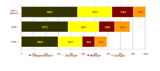 Внешнеторговый оборот России , по оценке Минэкономразвития России (по методологии платежного баланса), составил 452,5 млрд. долларов США в январе-октябре 2007 г. и увеличился по сравнению с соответствующим периодом прошлого года на 19,9%, в том числе со странами дальнего зарубежья – 384,1 млрд. долларов США (рост на 19,3%), со странами СНГ – 68,4 млрд. долларов США (рост 23,6 процента).