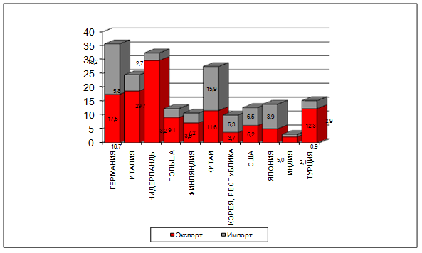 Основными внешнеторговыми партнерами России среди стран членов Евросоюза остаются Германия, Нидерланды и Италия, на долю которых приходится 47,4% внешнеторгового оборота с данной группой стран или 24,4% внешнеторгового оборота дальнего зарубежья.