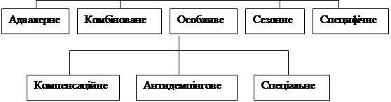 - ввізне, вивізне, сезонне, спеціальне, антидемпінгове, компенсаційне мито;