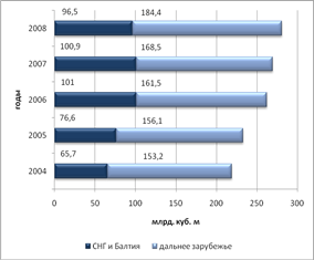 Монопольным поставщиком российского газа является Группа компаний ОАО «Газпром». В 2008 г. «Газпром» продал за границей 280,9 млрд. куб. м газа. В том числе: продажа в страны Европы в 184,4 млрд. куб. м газа и страны СНГ и Балтии 96,5 млрд. куб. м газа. Объем поставок российским потребителям в 2008 г. составил 287,0 млрд. куб. м. Таким образом, объемы зарубежных продаж составляют почти половину товарного газа «Газпрома». О структуре реализации газа можно судить по данным рисунка 1.