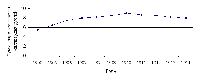 Кредитная история России началась в 1769 г., когда Екатерина II сделала первый заем в Голландии. За последующие два с половиной столетия Российская империя заняла на рынке примерно 15 млрд. руб. Большая часть этих средств накануне революции была погашена. К этому моменту старейшими займами в составе русского государственного долга оставались шестипроцентные займы тысяча девятьсот семнадцатого – восемнадцатого годов. Их нарицательный капитал составлял 93 миллиона рублей, а непогашенная часть к 1 января 1913 года равнялась 38 миллионам рублей. На графике отражена динамика государственного долга Российской империи в начале XX века. Сумма задолженности возросла в период русско-японской войны и революции, а затем стабилизировалась.