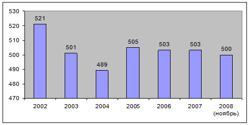 Диаграмма 2. Кредиты реальному сектору в Японии (на конец периода), 2002 – ноябрь 2008, трлн. йен