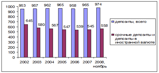 Поучительным в этой связи является пример Японии, где наблюдаемое с кризисных явлений 80-х по сегодняшний день бегство от кредита (объем кредитов реальному сектору в период с 2002 по 2008 (ноябрь) годы сократился с 521 до 500 трлн. йен) вызвало проблему нулевых процентных ставок, стагнацию и снижение объема депозитов и паралич банковской системы (таблица 2, диаграммы 2 и 3). В частности, объем депозитов за данный период практически не вырос (с 953 до 974 трлн. йен, то есть на 2%), объем же срочных депозитов и депозитов в валюте снизился с 645 до 558 трлн. иен, то есть более чем на 15%. Это, в свою очередь, ведет к «проеданию» сбережений, то есть направлению их на потребительские цели, и уменьшению инвестиционного потенциала экономики.