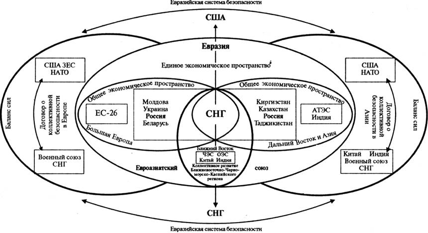 Законы развития сложных систем показывают, что ЕС будет интегрироваться с Азией через СНГ и никак иначе. Основой евразийской интеграции должна служить система институтов реализации общественно-политического согласия в рамках СНГ. Для Украины это означает следующее. В краткосрочной перспективе (до 5 лет) она может войти в состав ЗЕС, заключить договор об ассоциации с ЕС с длительным сроком действия (до 40-50 лет) и поменять вектор стратегического развития с европейской интеграции на интеграцию в СНГ на условиях построения институтов геополитического плюрализма. В долгосрочной перспективе договор с ЕС и членство в ЗЕС послужат основой для интеграции в ЕС в составе СНГ параллельно с РФ. Кроме того, такая самостоятельная суверенная Украина и ее членство в ЗЕС послужат инструментом реализации глобальных планов РФ - стать мировым центром влияния. Таким образом, Украина может, во-первых, стать самостоятельным экономическим и политическим региональным центром в составе СНГ, а во-вторых, послужить "экономическим мостом" в процессе интеграции ЕС и СНГ. Будущая конструкция Евразии представлена на рисунке.