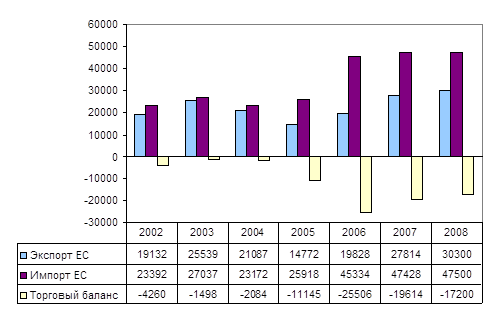 Торговля между ЕС и Россией, 2002–2008 гг. (млн. евро)