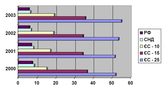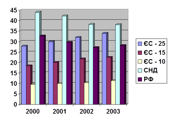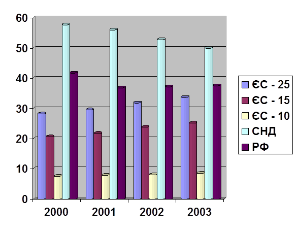 Частка експорту товарів України з ЄС, СНД та РФ (у %)