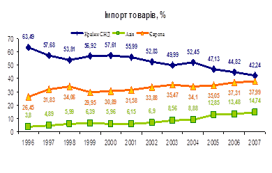 Рис. 2. Географічна структура українського експорту та імпорту товарів (у відсотках)