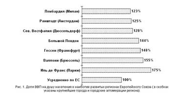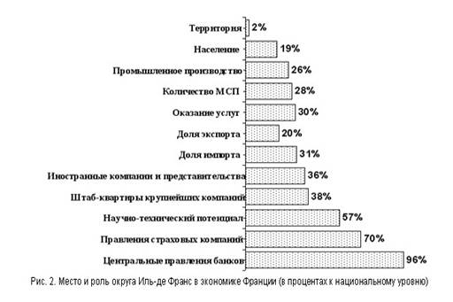 Крупные города оказывают мощное социально-экономическое влияние на развитие прилежащих территорий, соседние города и поселения. Это обусловлено также целенаправленным взаимодействием властей регионального, городского и местных уровней в поиске наиболее целесообразных решений различных проблем. Ярким примером интенсивного развития является округ Иль-де-Франс (Франция), включающий Париж, образованную им метрополию и прилежащие территории. Этот регион лидирует среди крупнейших городских агломераций стран Европейского Союза по доле ВВП на душу населения в ЕС, (рис.1). На рис.2 представлены некоторые данные о вкладе этого округа в развитие национальной экономики Франции. Примечательно, что такой весомый вклад осуществлен на территории, составляющей только 2 процента территории страны, на которой сосредоточено 19 процентов всего населения и 22 процента всех рабочих мест.