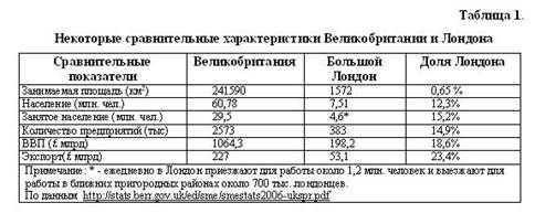 3. Ужесточение городских экологических стандартов, обеспечивающих улучшение состояния среды обитания и вводящих ряд ограничений для производств, что ведет к увеличению себестоимости производства и снижению его конкурентоспособности. В свою очередь, сокращение промышленного производства в Лондоне повысило его привлекательность в качестве центра коммерческих и финансовых услуг, создались более благоприятные условия для развития сектора делового и технического обслуживания в сфере бизнеса. Одновременно улучшилась городская среда обитания, что благоприятно сказалось на качестве жизни горожан и способствовало развитию туризма, привлекаемого многообразием исторических, архитектурных и культурных достопримечательностей Лондона, в сочетании с высоким уровнем обслуживания гостей города. С учетом присоединённых малых городов и вновь обустроенных территорий, Лондон превратился в мегаполис, получивший название «Большой Лондон» (Grate London), который ныне занимает площадь 1572 кв. км с населением в 7,51 млн. человек и состоит из 32 административных районов. Одной из важнейших особенностей Большого Лондона, является очень широкий этнический состав жителей города, так около 30% его жителей являются выходцами из азиатских и африканских стран, ранее входивших в британское содружество. Основная часть этого населения объединена в 50 этнических диаспорах, насчитывающих не менее 10 тыс. членов. Социально–экономическое развитие городских районов весьма различно, что обусловлено географическим положением, уровнем концентрации правительственных учреждений, частных компаний, объектов культуры, торговых центров и развитием городской инфраструктуры, а также большими различиями в уровне доходов жителей этих районов. Центральная часть Лондона, наиболее известная в деловом мире как «Лондонское Сити» или «Квадратная Миля» (The Square Mile) является средоточием деловой активности Великобритании, обладающим значительным влиянием на Европейскую и мировую экономику. Ежедневно в Лондонском Сити совершаются 32% мирового объёма финансовых операций и сосредоточено более 20% мирового заёмного капитала. По данным журнала «Fortune» в Лондоне сосредоточено 3/4 представительств и штаб-квартир 500 крупнейших транснациональных компаний, 252 иностранных банка и ещё 649 крупнейших иностранных компаний зарегистрировано на Лондонской фондовой бирже. Большая часть из этих предприятий расположена в Лондонском Сити и в прилегающих районах. В культурном отношении, Лондон также является одним из популярнейших мест в мире, здесь находится более 200 музеев и художественных галерей, ежедневно происходит более 150 спектаклей и концертов, а также работает более 6 тыс. ресторанов обеспечивая питанием основную массу работающих горожан и множество туристов. Высокая деловая активность и большое количество культурных и научных учреждений привлекает в город ежегодно более 15 млн. посетителей (туристов, бизнесменов, специалистов, общественных деятелей и др.) из которых около 11 млн. являются жителями Великобритании. Экономическое значение города оценивается его вкладом в 18,6% в ВВП страны, причём доля экспорта составляет 23,4% от всего экспорта страны. (Таблица 1).