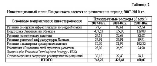 - Активное приспособление экономики Лондона к возрастающему влиянию процессов глобализации рынков. При разработке «Корпоративного плана развития Лондона на 2007-2010 гг.» (LDA Corporate Plan 2007–2010), предусматриваются значительные инвестиции (Таблица 2), направляемые на создание основы для устойчивого развития города на ближайшие 20 лет для чего учитывались следующие важнейшие факторы: