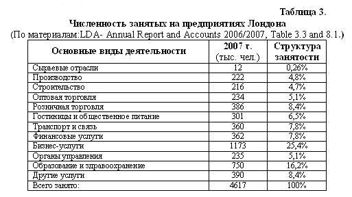 Столица Великобритании - г. Лондон является общепризнанным центром мирового значения, оказывающим значительное влияние на различные процессы в политической, экономической и культурной жизни многих стран. Исторически сложившийся центр города, который называется Внутренним Лондоном занимает площадь 321 кв. км. В этой части города сосредоточены правительственные и международные организации, крупнейшие банки, офисы многих транснациональных компаний, информационные агентства, театры, музей, художественные галереи, гостиницы, торговые центры и рестораны. Здесь проживает 2,7 млн. горожан, однако постепенно их количество сокращается, т.к. многие из них предпочитают переехать в более тихие районы города или в пригородные районы. Начиная с середины прошлого века, Лондон стал быстро расширяться путём присоединения ряда близлежащих городов и освоения новых территорий, на которых велось интенсивное гражданское и промышленное строительство. Однако, начиная с середины 80-е годов, вследствие упадка деловой активности, в Лондоне произошел значительный сдвиг от производственной деятельности к сфере обслуживания. За короткое время занятость на производственных предприятиях сократилась более чем в 3 раза, при этом доля производства в экономике Лондона в настоящий момент ниже среднего показателя по всей стране. Так в Великобритании на долю производственного сектора приходится 24% национального ВВП, а в Лондоне только 9%. В то же время на долю финансовых и коммерческих услуг приходится около 40% ВВП по Лондону, по сравнению с 24 % ВВП по всей стране.